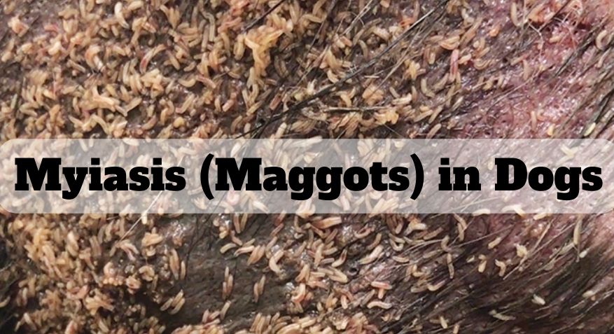 Myiasis is caused by a female fly, usually a blowfly, laying eggs in a festering wound, on areas of the skin that are consistently damp, or on areas of skin that are soiled by urine or feces. This is more likely to occur during the warmer months and in hot, moist environments. This occurs most commonly in dogs that are consistently dirty, who are seriously wounded, or have impaired mobility. Persistent skin infections or allergies can also increase the risk of maggot infestation.