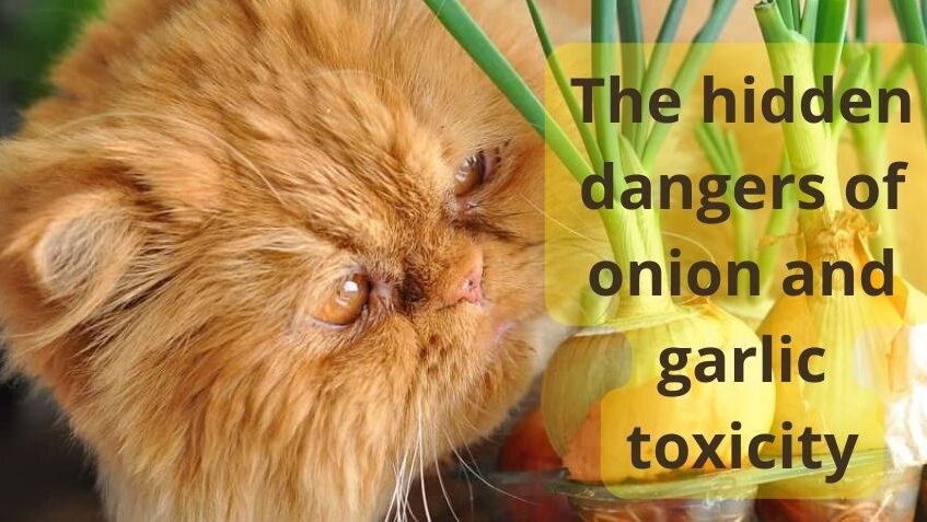 Onions and garlic contain a substance called thiosulphate which dogs and cats cannot properly digest. A build-up of thiosulphate causes a protein called hemoglobin, which is carried by red blood cells, to form clumps which in turn cause the red blood cells to rupture.