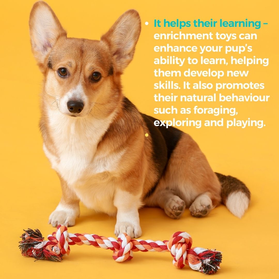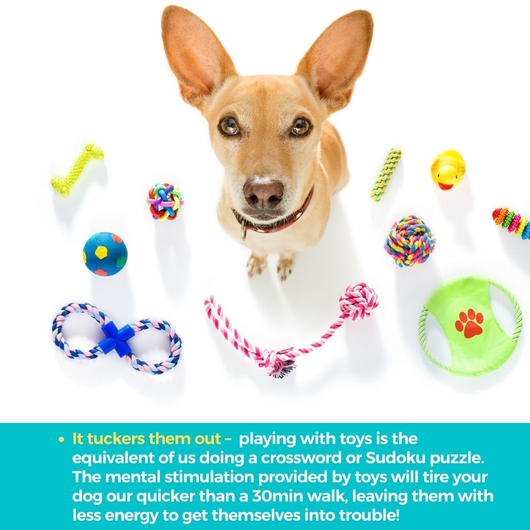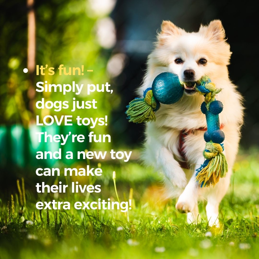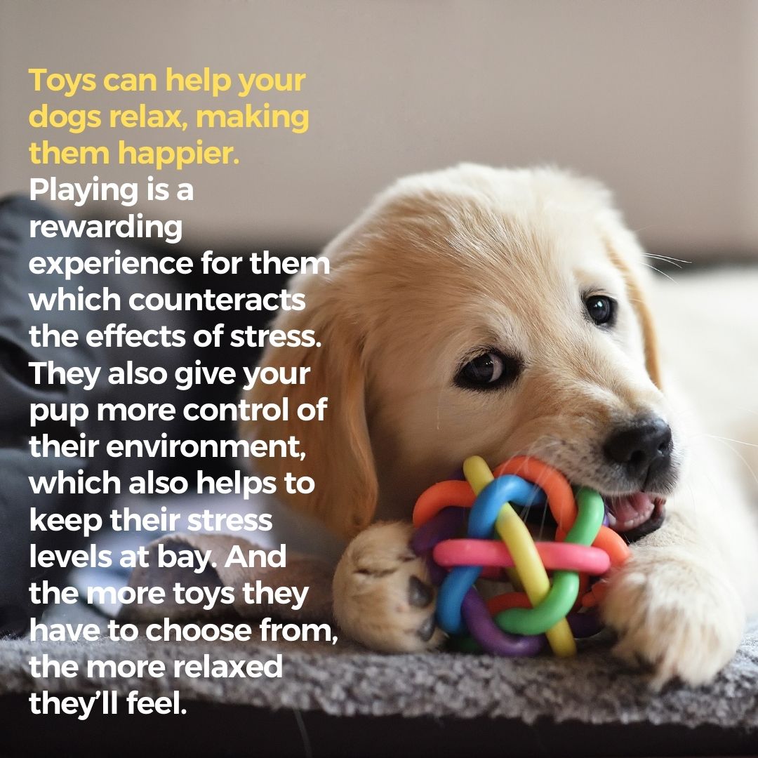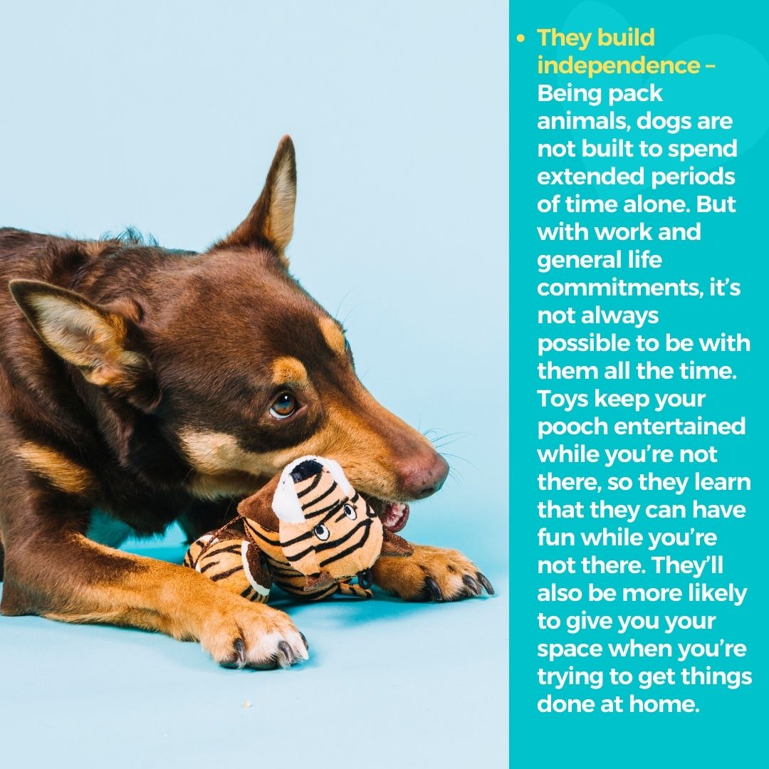 Especially when your dog is a puppy, it’s important to give them access to toys, specifically teething toys. During their developmental period (for puppies, it is between 2 months to 10 months), it’s crucial to allow young dogs to chew on toys and get the relief they need from teething. Teething is very uncomfortable for them, so it is wonderful to build the relationship now with chew toys being a positive association! Do not give them toys that would resemble household objects that they are not supposed to chew on, such as a tv remote plush or a rubber shoe chew toy. This allows your pet to distinguish chewable things from non-chewable ones and will make it much easier in the future to build that better habit.